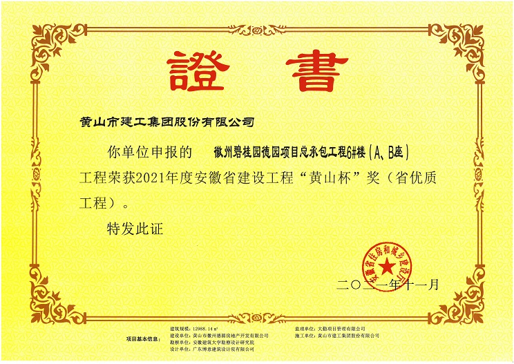 由乐鱼网页版登录入口承建的徽州区碧桂园德园项目总承包工程6#楼(A、B座) 工程荣获安徽省工程质量最高奖“黄山杯”奖。该工程在开工伊始,项目部就制订了创优目标,严格过程控制,建立健全项目质量管理体系,狠抓现场施工管理,把好施工过程质量控制关,为创精品工程打下坚实的基础。
