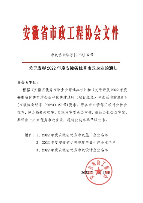 近日,安徽省市政工程协会公布了“2022年度安徽省优秀市政施工企业”名单。乐鱼网页版登录入口股份有限公司被安徽省市政协会评为“2022年度安徽省优秀市政企业”。该项荣誉是由各市主管部门或行业协会推荐,经省市政协会秘书处初审,专家评审委员会审核,安徽省市政工程协会最终审定。