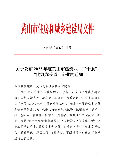 近日,黄山市住房和城乡建设局发布的《2022年度黄山市建筑业二十强企名单》中,乐鱼网页版登录入口股份有限公司荣获2022年“黄山市建筑业企业二十强”。