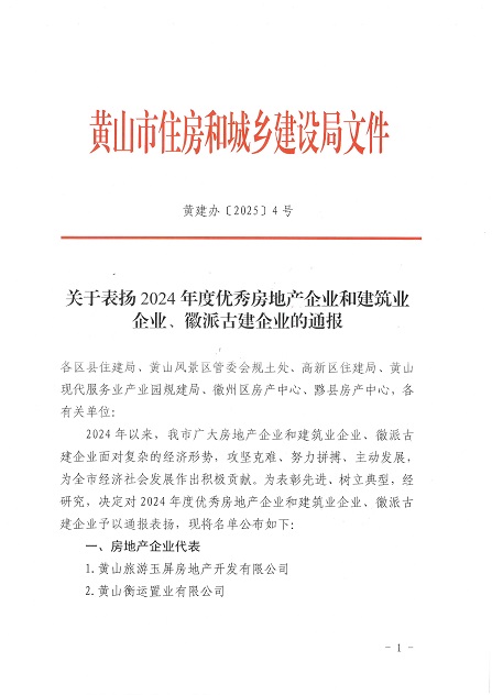 近日,黄山市住房和城乡建设局发布了《关于表扬2024年度优秀房地产企业和建筑业企业、徽派古建企业的通报》,乐鱼网页版登录入口荣获2024年度优秀建筑业企业称号。