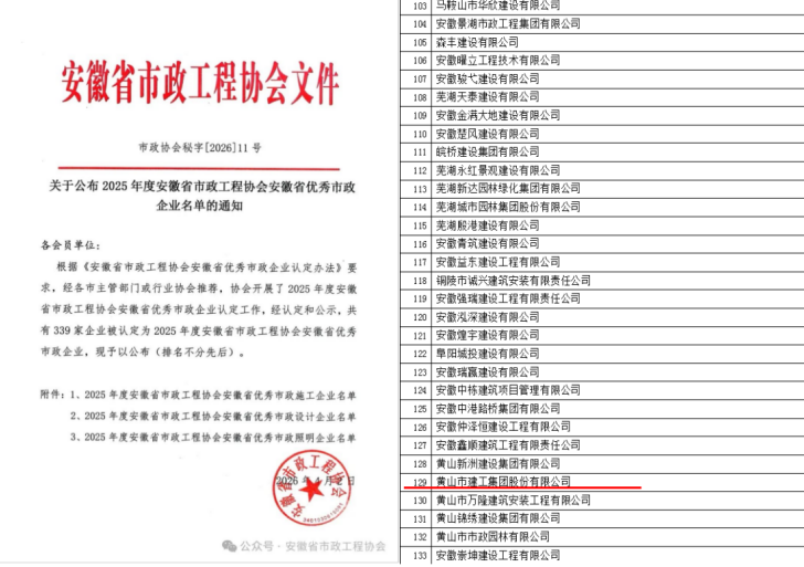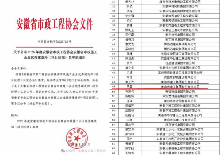 近日,安徽省市政工程协会发布了《关于公布2025年度安徽省市政工程协会安徽省优秀市政施工企业名单的通知》及《关于公布2025年度安徽省市政工程协会安徽省市政施工企业优秀建造师(项目经理)名单的通知》。乐鱼网页版登录入口凭借卓越的综合实力与优质的工程业绩,连续多年荣登“2025年度安徽省优秀市政施工企业”榜单。这也是继集团获“2024年度安徽省优秀建筑业企业”后,在工程建设领域收获的又一重量级荣誉。 同时,黄正光、吕震两位同志凭借扎实的专业素养和出色的项目管理能力,双双荣获“安徽省市政施工企业优秀项目经理”称号。
