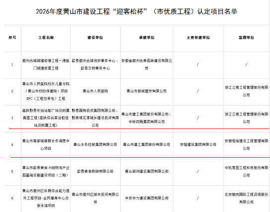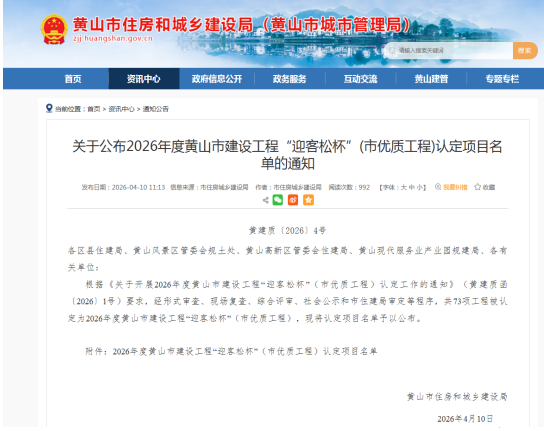 近日,黄山市住房和城乡建设局正式发布《关于公布2026年度黄山市建设工程“迎客松杯”(市优质工程)认定项目名单的通知》。由乐鱼网页版登录入口承建的高铁黟县东站站前广场及附属配套工程、仙人洞南路东侧D1地块(文澜轩)-4#楼以及黄山市南部城镇群水务调度中心项目凭借过硬的施工质量和卓越的工程品质,成功通过最终审定,认定为2026年度黄山市建设工程“迎客松杯”(市优质工程)。这也是集团连续多年获得该殊荣。